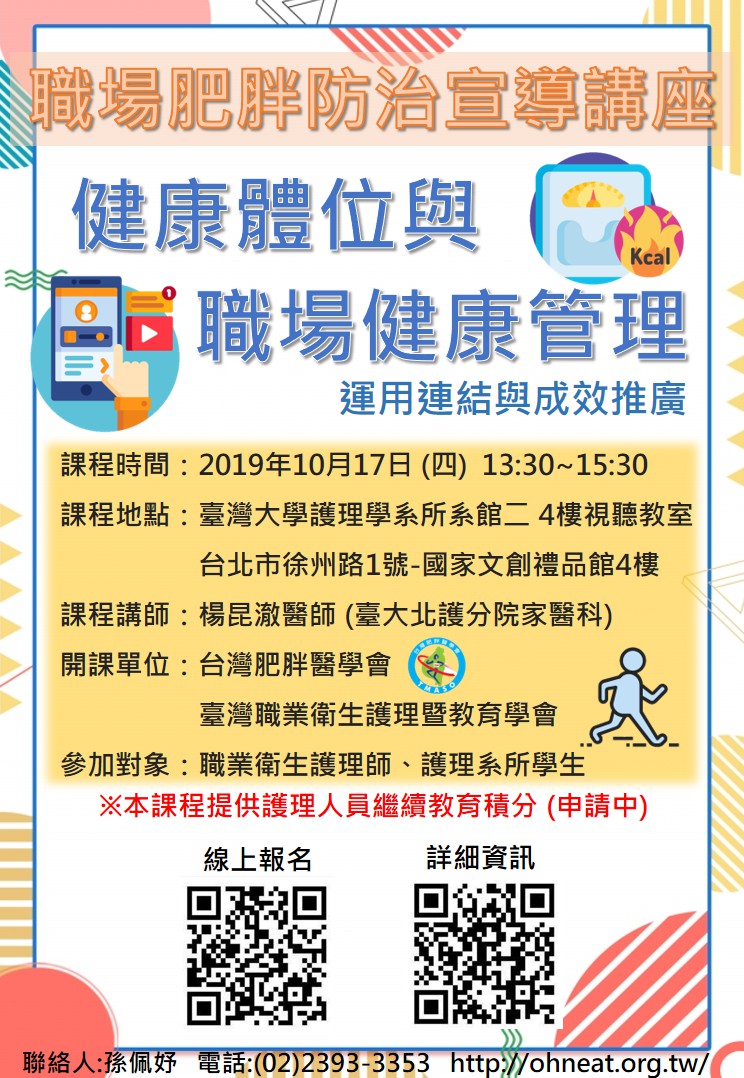 | 主辦單位 | 衛生福利部國民健康署、台灣肥胖醫學會、臺灣職業衛生護理暨教育學會 |
