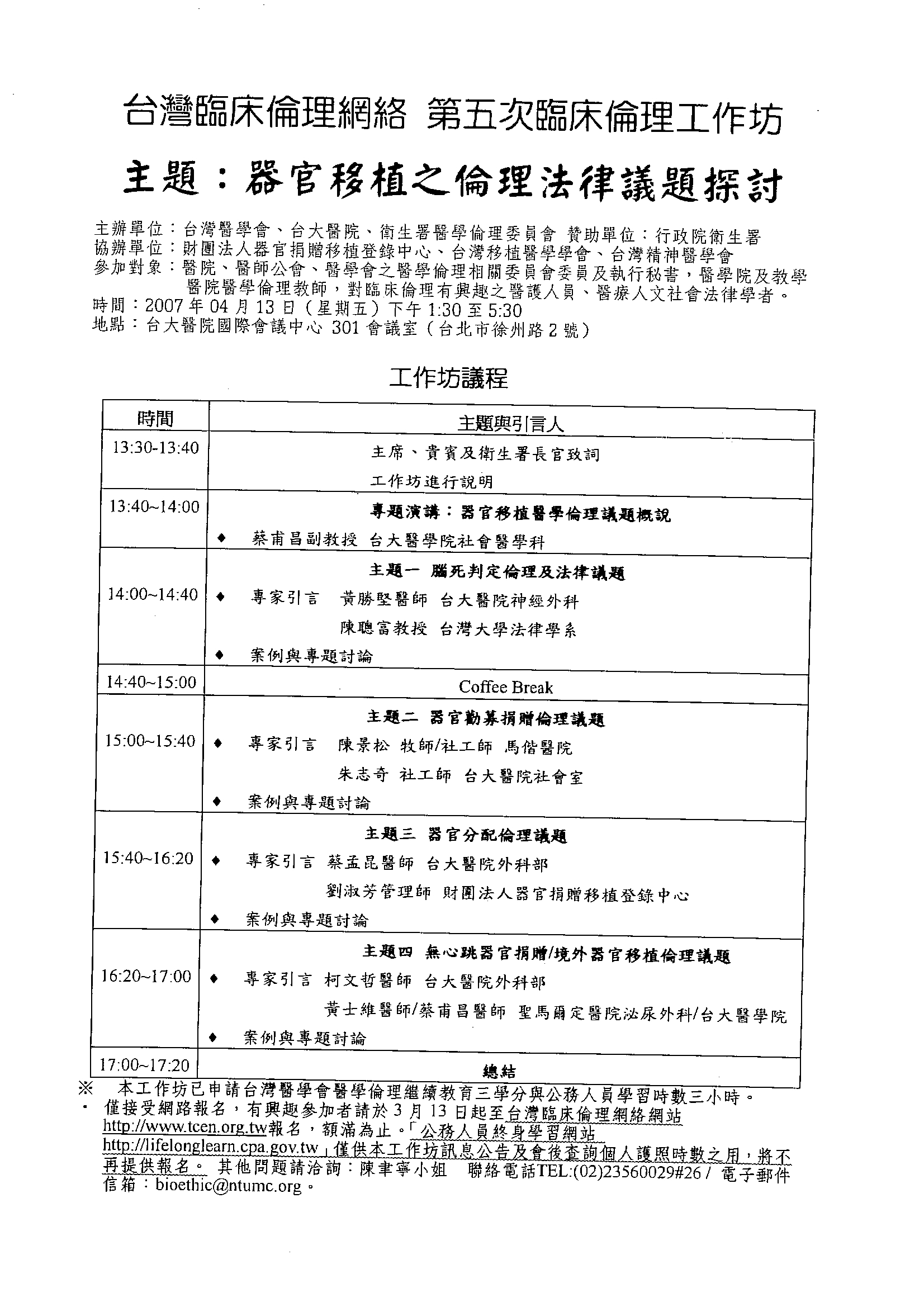 台灣臨床倫理網絡第五次臨床倫理工作坊:器官移植之倫理法律議題探討 |