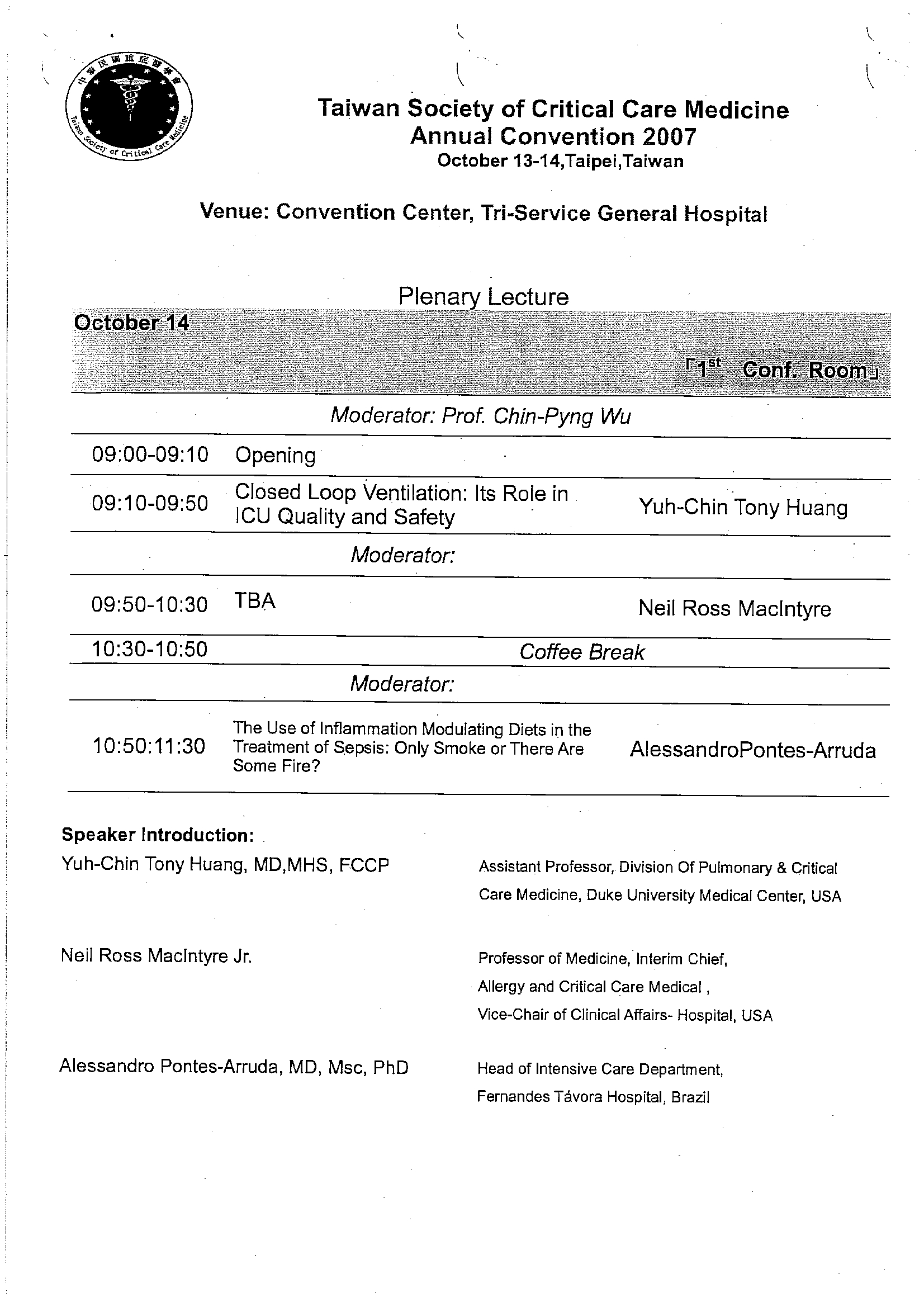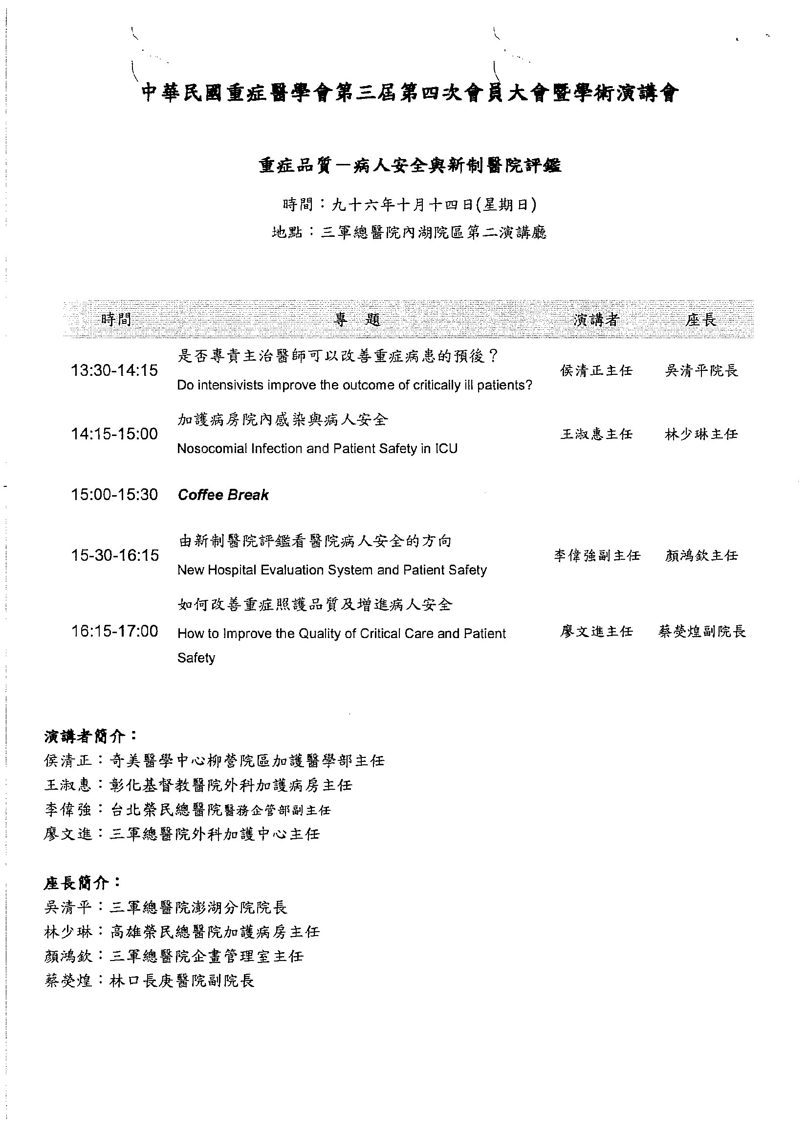 過去活動 基本資料 活動主題 台灣重症醫學會第三屆第四次會員大會暨學術研討會(第一天) 活動日期 96年10月13日 - 96年10月13日 活動地點 三軍總醫院內湖院區演講廳 主辦單位 台灣重症醫學會 收費 不收費 認定資料 課程代號 333 積分 乙類 2 學分 認定時數 8 參加身份 聯絡資料 聯絡人 許盈禎 聯絡電話 02-26346181 附加檔案 節目表1 節目表2 節目表3 節目表4 返回清單