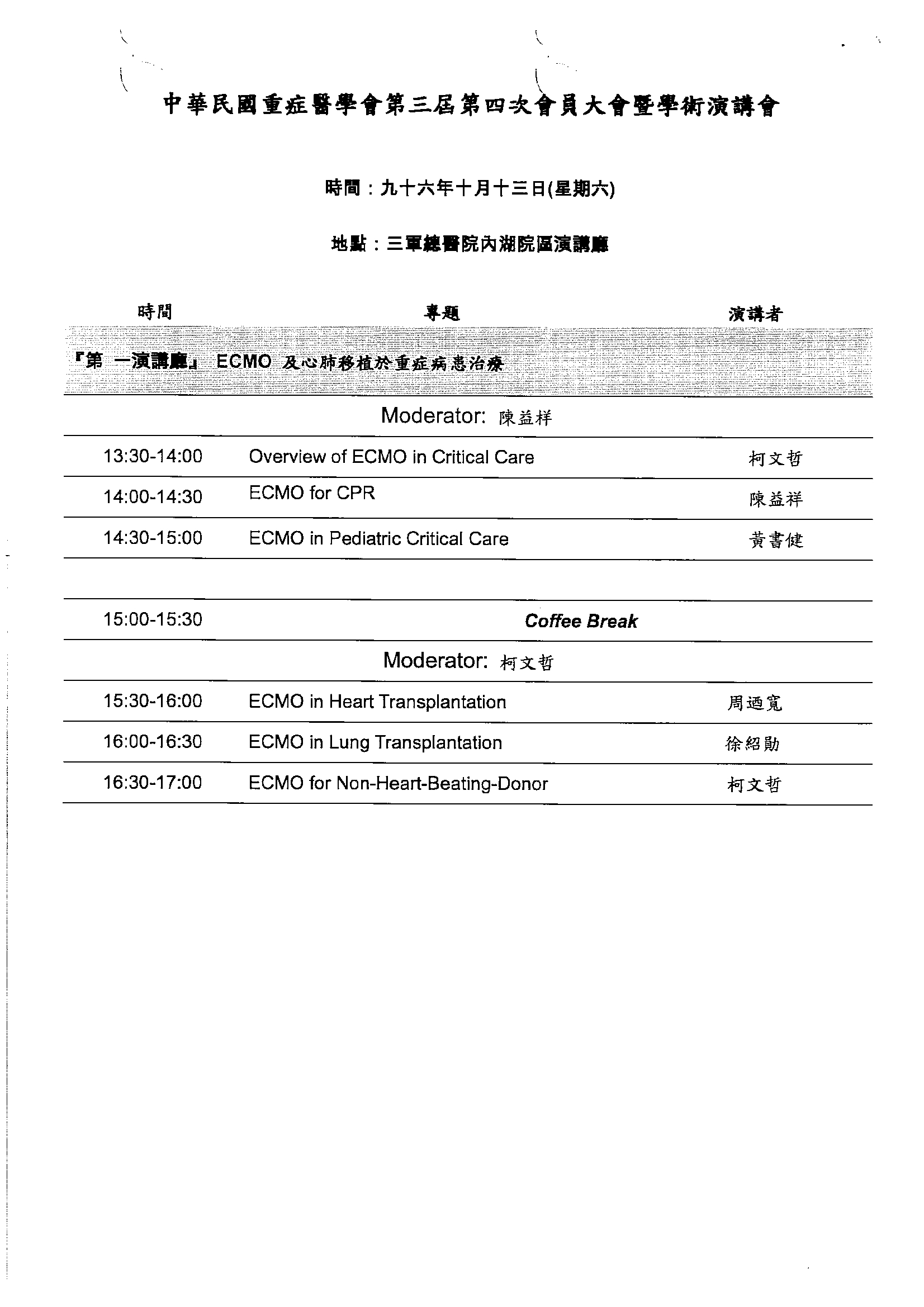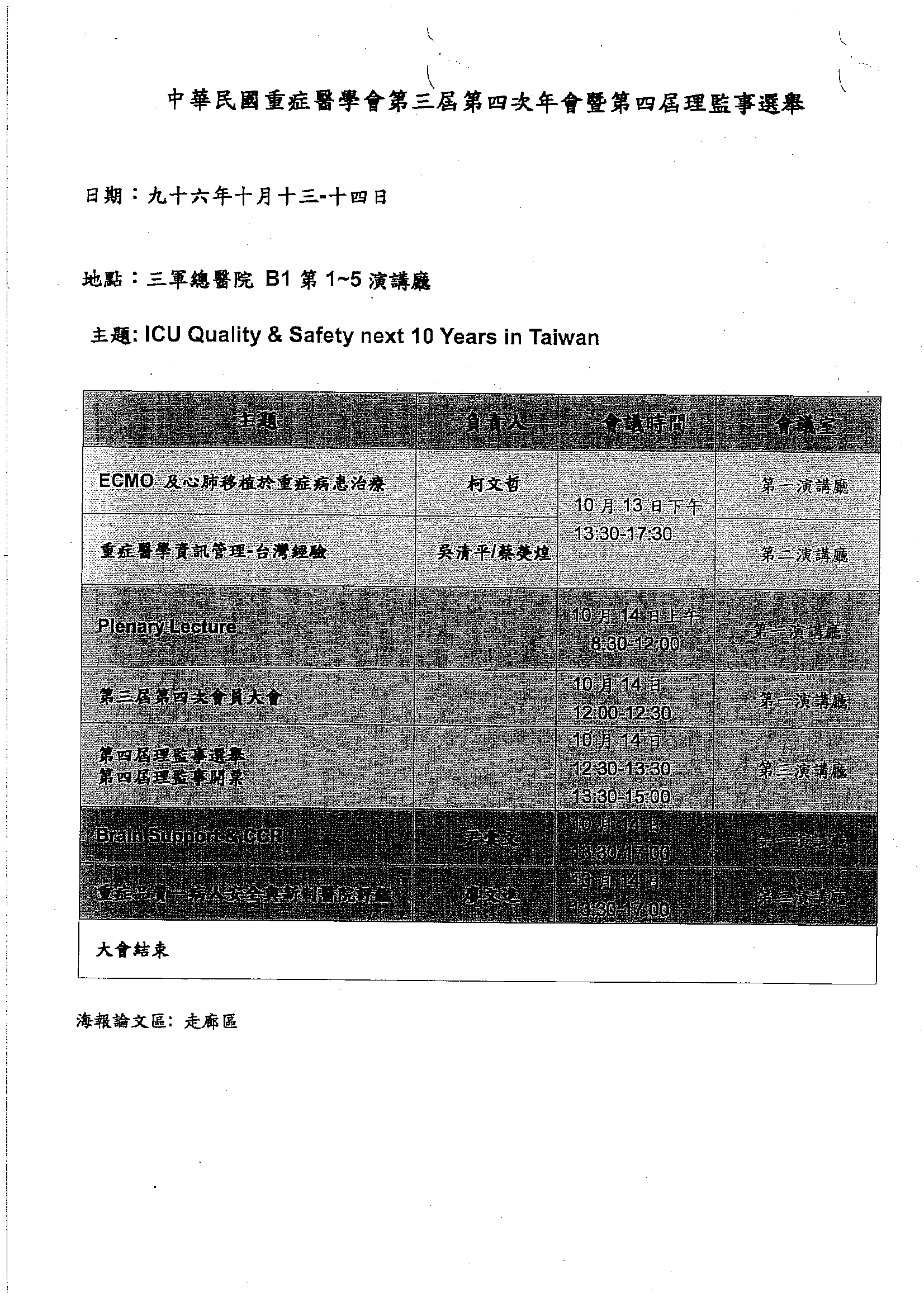 過去活動 基本資料 活動主題 台灣重症醫學會第三屆第四次會員大會暨學術研討會(第二天) 活動日期 96年10月14日 - 96年10月14日 活動地點 三軍總醫院內湖院區演講廳 主辦單位 台灣重症醫學會 收費 不收費 認定資料 課程代號 334 積分 乙類 2 學分 認定時數 8 參加身份 聯絡資料 聯絡人 許盈禎 附加檔案 節目表1 節目表2 節目表3 節目表4 返回清單