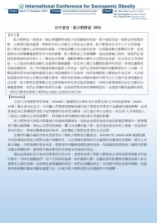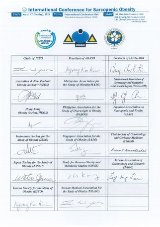 由亞大地區老年學暨老年醫學會(International Association of Gerontology & Geriatrics Asia/Oceania Region)、亞大肥胖研究學會(Asia Oceania Association for the Study of Obesity)與台灣肥胖醫學會(Taiwan Medical Association for the Study of Obesity)共同於3月17日在中國醫藥大學水湳校區主辦2024肌少肥胖症國際研討會。有來自亞洲大洋洲,包括日本、韓國、台灣、大陸、菲律賓、泰國、馬來西亞、新加坡、印尼、印度等10個國家的200多位專家學者參與,共同探討肌少肥胖症的流行病學、診斷、治療與預防。