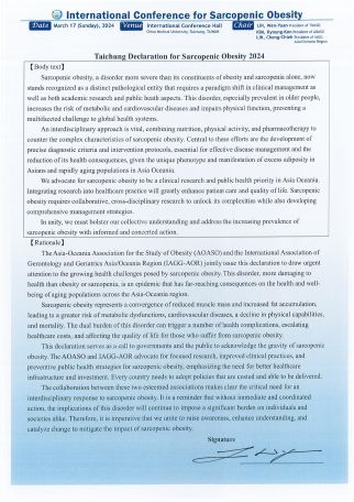 「台中宣言」指出,肌少症是一種重要的公共衛生問題,需要引起各國政府和醫界的重視。宣言呼籲各國:加強肌少肥胖症的健康教育和宣導,提高公眾意識,建立完善的監測系統;加強肌少肥胖症的基礎研究;加強肌少肥胖症的流行病學研究與開發有效的肌少肥胖症治療方法。