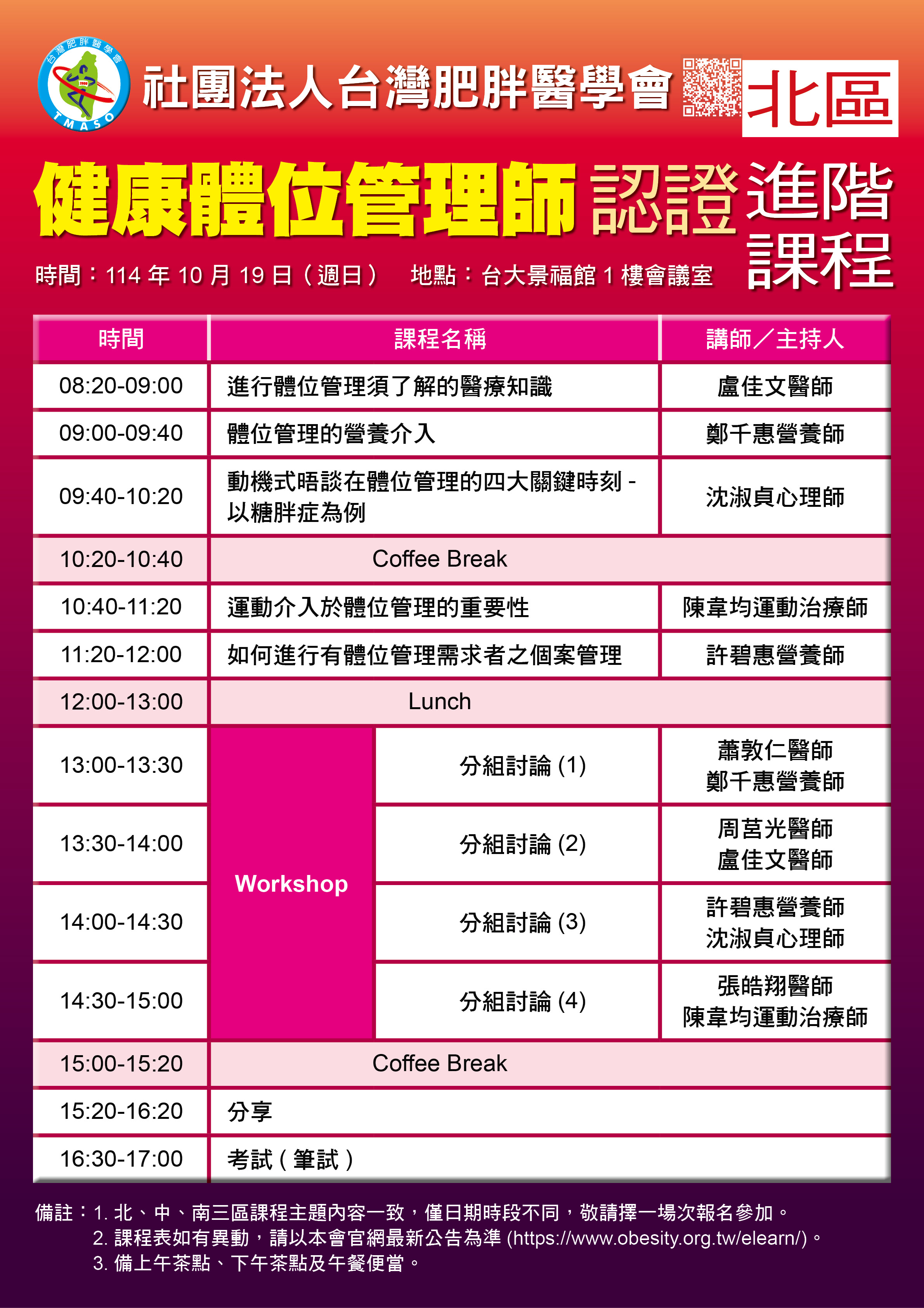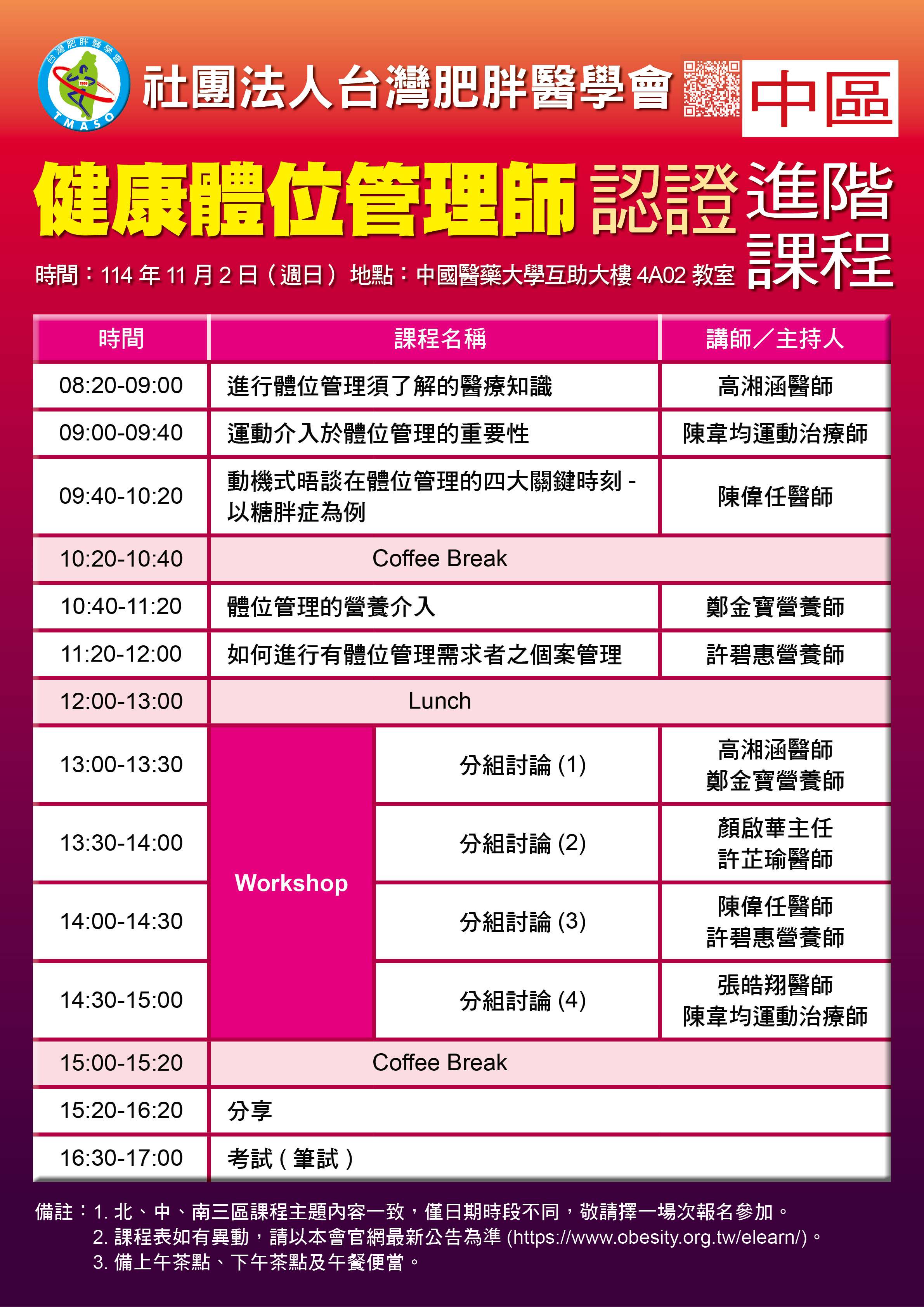 全部訊息 114/08/18 活動消息 【認證課程】台灣肥胖醫學會「114年健康體位管理師認證課程」 各區「健康體位管理師」認證課程 南區:9月28日/成大醫學院1樓第二講堂 北區:延期至10月19日/台大景福館1樓會議室 中區:延期至11月2日/中國醫藥大學互助大樓4A02教室 報名連結:http://www.obesity.org.tw/elearn/ http://www.obesity.org.tw/elearn/ 訊息清單